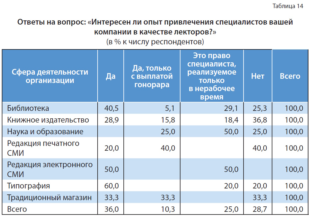 Ответы на вопрос: «Интересен ли опыт привлечения специалистов вашей компании в качестве лекторов?» — представлены в табл. 14. Анализ показывает, что такой формат сотрудничества интересен 36% респондентов, в том числе 40,5% представителей библиотек и почти трети издателей. О том, что это право специалиста реализуется исключительно в нерабочее время, заявили четверть опрошенных.