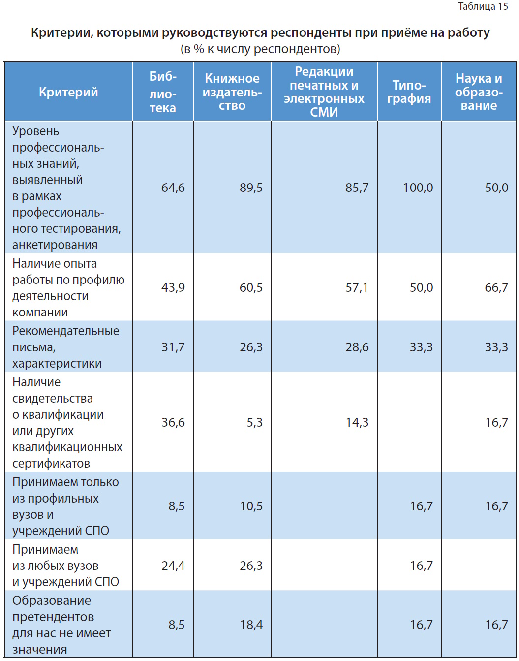 Ответы на вопрос: «Какими критериями Вы руководствуетесь при приёме на работу?» — характеризуют данные табл. 15.