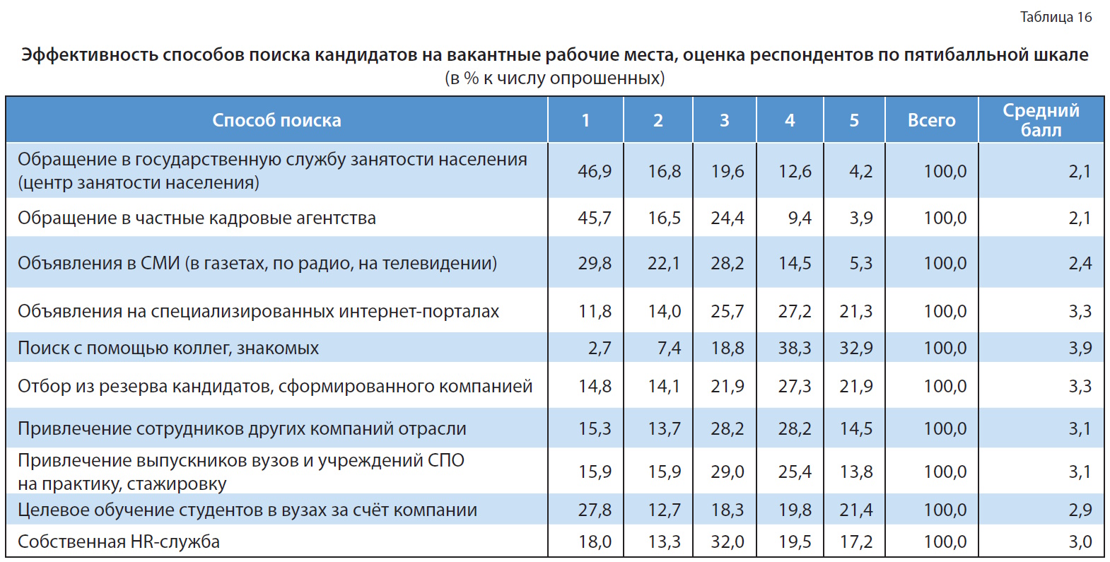 В ходе исследования респондентам было предложено оценить эффективность способов поиска кандидатов на вакантные рабочие места по пятибалльной шкале. Результаты представлены в табл. 16.