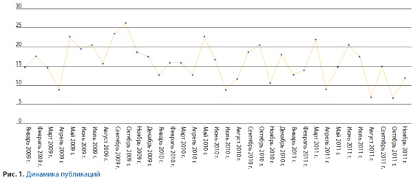 Ежегодно результаты таких медиа исследований становятся отправной точкой для преддипломных и дипломных исследовательских работ студентов четвёртого-пятого курсов. Ведь прежде чем развивать имидж вуза, необходимо понять, что он представляет собой в данный момент и как он транслируется на аудиторию. Немного о технологии исследования. Работа выполнялась по фондам интернет-библиотеки Public.ru, анализировалась центральная и региональная пресса с января 2009 г. по ноябрь 2011 г. Отбор публикаций проводился с использованием в поиске таких ключевых слов, как ГУУ и «Государственный университет управления». Из анализа исключались нерелевантные для данного исследования статьи, например те, в которых упоминания вуза носили эпизодический характер. В итоге для подробного анализа было отобрано 1127 публикаций из 705 газет. При дальнейшем анализе пула статей со значимыми упоминаниями ГУУ мы использовали сервис медиастатистики Public.ru, который позволил оперативно и наглядно представить различные количественные срезы всего обширного информационного массива. На одном из таких интерактивных графиков мы легко смогли увидеть динамику публикаций сразу за три года и проанализировать всплески медиаинтереса к ГУУ (рис. 1).
