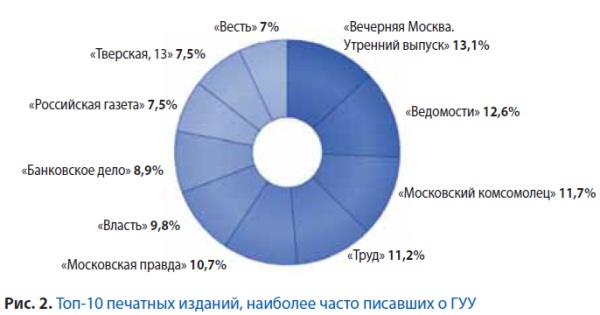 Не менее наглядным и интересным для нас оказался и другой медиа-отчёт ЭБС Public.ru – рейтинг изданий, наиболее часто публиковавших на своих страницах информацию о ГУУ. В Топ-10 таких изданий (рис. 2) вошли наиболее перспективные для дальнейшей работы над имиджем вуза СМИ.