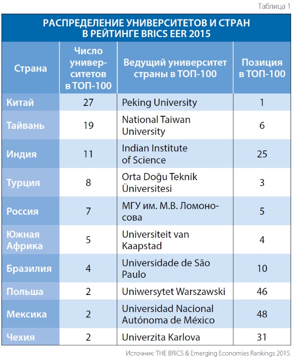 Такая компания подобралась в рейтинге университетов стран BRICS и стран с развивающейся экономикой (THE BRICS & Emerging Economies Rankings), первый выпуск которого был опубликован в конце 2013 г. В начале декабря 2014 г. Фил Бейти (Phil Baty), шеф-редактор рейтинга THE WUR, привёз в Россию последнюю версию рейтинга (далее — BRICS EER 2015). Методика BRICS EER настроена на измерение достижений университетов из стран, которые в течение ближайшего десятилетия станут мировыми экономическими лидерами. В этих странах, как правило, активно распространяется предпринимательская модель вузов, часть которых далее развивает исследовательские компоненты. В целом такая гибридная модель достаточно близка к образцу, по которому развиваются российские университеты-лидеры. В методике BRICS EER внесён ряд существенных изменений по сравнению с базовой методикой, которая лежит в основе основного рейтинга THE WUR: