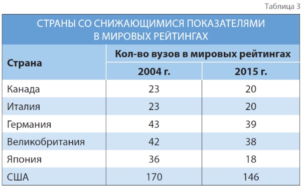 А вот данные табл. 3 характеризуют снижение количества вузов в рейтингах, несмотря на реализацию программ академического превосходства.