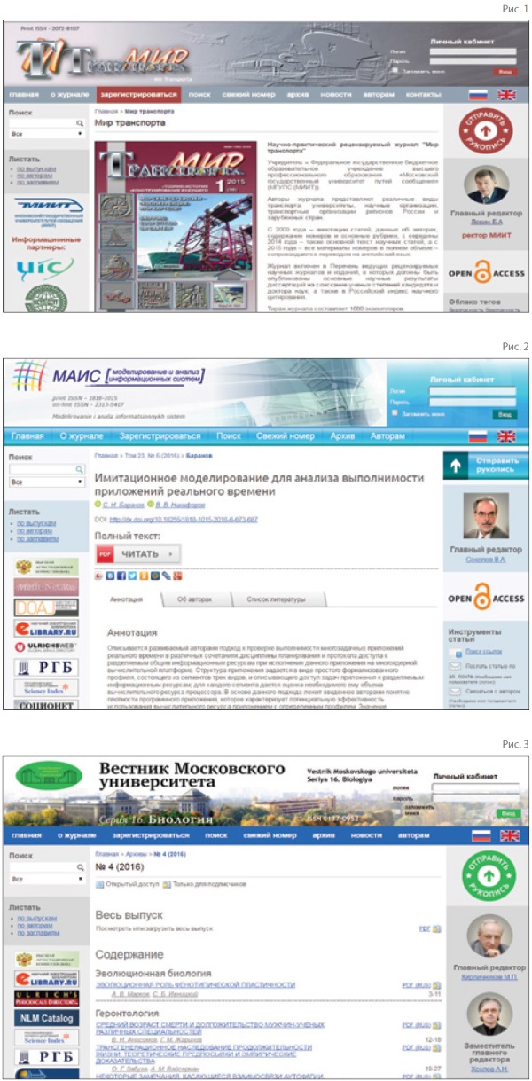 Для ознакомления с новыми технологиями всем редакциям журналов — победителей конкурса была предоставлена возможность организовать производственный цикл подготовки журнала от поступления рукописи до опубликования её на веб-сайте на базе издательской платформы ElPub. На рис. 1–3 приведены примеры трёх университетских журналов, размещённых на этой площадке.