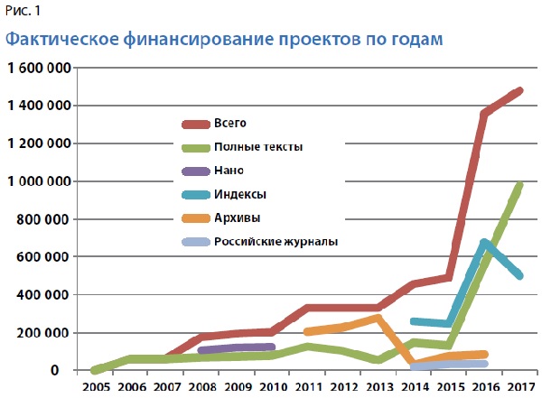 Цифры показывают, что с 2015 г. наблюдается резкий рост объёма финансирования проектов, которые так или иначе касаются информационного обеспечения науки. Это во многом связано с тем, что стоимость ресурсов выражена в валюте, а 2015-й был годом кризиса в этой сфере. Важность научной информации в сегодняшних условиях наконец оказалась оценена.