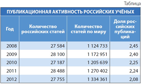 Идея поддержки возникла не на пустом месте. Всем известен Указ Президента РФ № 599, в соответствии с которым нужно было увеличить долю публикаций российских исследователей в Web of Science до 2,44%. Показатель с 2008 г. неуклонно снижался и упал до 2,08% (таблица).