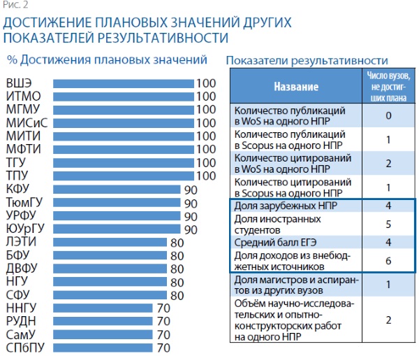 Четыре вуза не достигли запланированных показателей по числу зарубежных научно-педагогических работников, пять университетов — по количеству иностранных студентов, четыре — по среднему баллу ЕГЭ и доле доходов из внебюджетных источников (рис. 2).