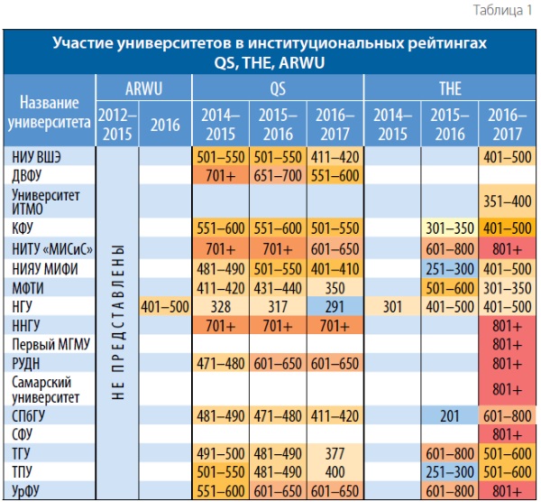 У нас не только не очень хорошо с продвижением в рейтингах: есть и негативная динамика. Так, в рейтинге THE ухудшили свои позиции Уральский федеральный университет, Нижегородский государственный университет и другие участники проекта, которые, очевидно, не вполне корректно формируют программы повышения конкурентоспособности и дорожные карты, позволяющие их реализовывать (табл. 1).