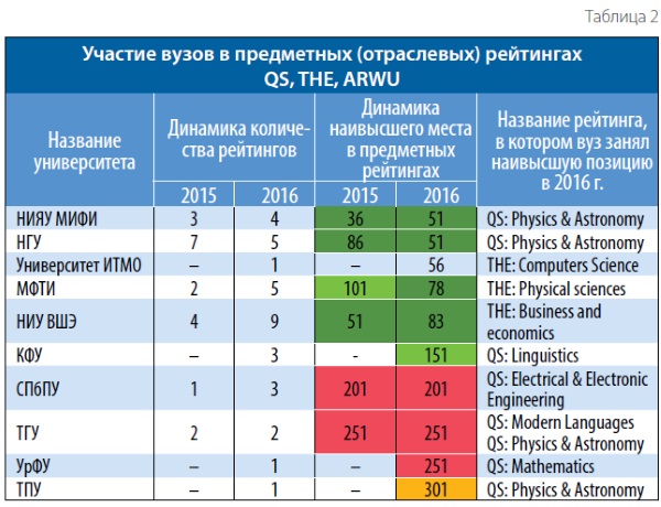 Что касается уже упомянутых предметных рейтингов, там университеты представлены более широко (табл. 2); пять участников входят в первую сотню ведущих мировых научно-образовательных центров. Наши традиционно сильные научные области — это гуманитарные и компьютерные науки, физика. Но было бы значительно лучше, если бы мы расширили их количество. Практически все вузы в своих дорожных картах запланировали развитие стратегических академических единиц по направлению «Науки о жизни». Но тогда результаты этой работы должны отражаться и в предметных рейтингах, и в публикационной активности.