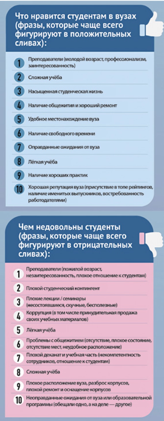 Как показал анализ, студентов волнует прежде всего преподавательский состав (возраст, компетентность, отношение к студентам), образовательный процесс (качество лекций, семинаров, наличие мастер-классов, учебный план, расписание, уровень сложности обучения), студенческая жизнь (университетские традиции, возможность творчества), общежитие, расположение вуза, контингент однокурсников, наличие свободного времени и т.д. Распределение этих факторов в зависимости от характера отзыва (положительный или отрицательный) иллюстрирует рисунок.