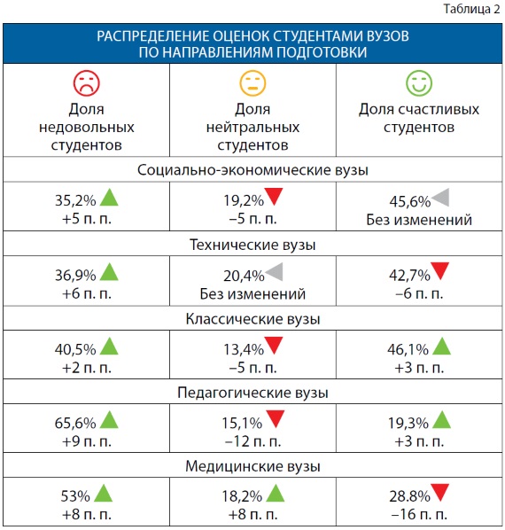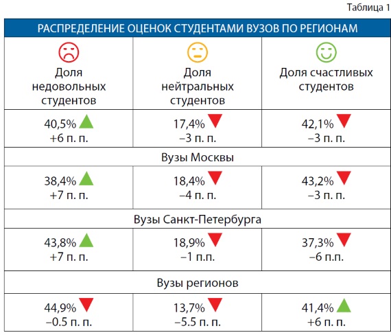 Как отметил эксперт, в нынешнем году в целом по стране недовольных студентов оказалось 40,5% — это на 6 п. п. больше, чем в прошлом (табл. 1), в то же время доля довольных респондентов упала на 3 п. п. и составила 42,1%. Самые счастливые студенты в этом году учатся в Москве, а менее всего удовлетворённые своими вузами — в регионах, хотя по сравнению с прошлым годом доля счастливых студентов в регионах выросла.