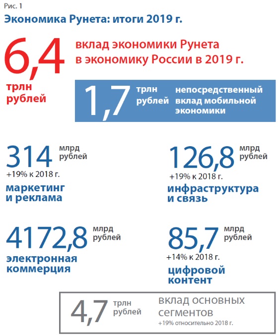 ИТ-сегмента в 2020 г., генеральный директор РАЭК Сергей ПЛУГОТАРЕНКО отметил, что в 2019 г. отрасль выросла на 19%, обеспечив вклад в экономику России на уровне почти в 6,5 трлн рублей (рис. 1). В 2020-м прогнозировался ещё более значительный прогресс. Очевидно, что события первой половины 2020-го внесли серьёзные коррективы, и эксперты вынуждены были изменить прогнозы.