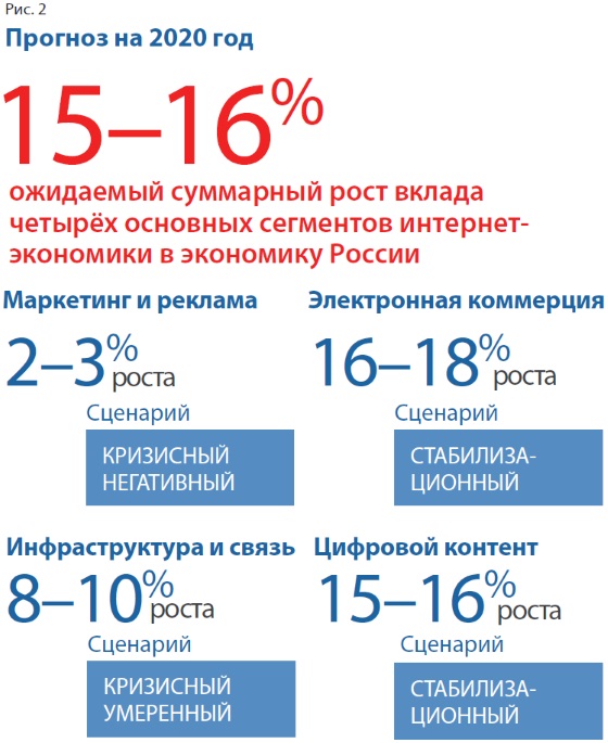 — Впервые мы ощутили реальность кризисного сценария развития Рунета. В апреле мы прогнозировали, что до конца текущего года реализуются умеренный (6–10% роста) или негативный (0–5%) сценарии. При этом было очевидно, что некоторые сегменты провалятся, несмотря на то что нашу отрасль называли выгодоприобретателем от происходящего. Мы говорили, что это не так, что Интернет серьёзно связан с реальным миром. В результате экстраполяции данных первого — третьего кварталов стало понятно, что по итогам года отрасль вырастет на 15–16%. Но это произойдёт при условии, что у населения останутся деньги: рост обеспечат те технологии и сервисы, которые связаны с пользователями. Бизнес ужался и в первую очередь свернул инфраструктурные проекты, но цифровой контент и электронная коммерция продолжат расти, если покупательная способность не упадёт катастрофически (рис. 2).