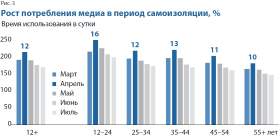 Самоизоляция была интересным периодом для большого числа медийных ресурсов. Интернет и ТВ с точки зрения роста аудитории стали главными бенефициарами, меньше повезло радио и прессе. В период пандемии по времени, проведённому в Сети, выросли все возрастные группы, что характерно для большинства электронных медиа (рис. 3).