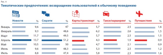Пока был жёсткий карантин, мы наблюдали серьёзные изменения с точки зрения того, что люди делают в Интернете, и того, сколько времени они там проводят. Сейчас жизнь возвращается к нормальным показателям, к тем приоритетам и цифрам, которые были до начала пандемии (рис. 4).