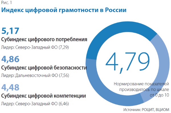 Уже не первый год РОЦИТ совместно со ВЦИОМ проводит исследование цифровой грамотности россиян. На сегодняшний день индекс цифровой грамотности пользователей Рунета составляет 4,79 из 10 возможных, субиндекс цифрового потребления — 5,17, субиндекс цифровой безопасности — 4,86, а субиндекс цифровой компетенции — 4,48 (рис. 1). При этом каждый десятый россиянин использует приложение интернет-банкинга, у 91% населения старше 18 лет есть мобильный телефон или смартфон, 33,5% россиян обращаются к Интернету в качестве источника новостей почти каждый день и лишь четверть пользователей полностью уверены в своих силах в вопросах цифровой грамотности.