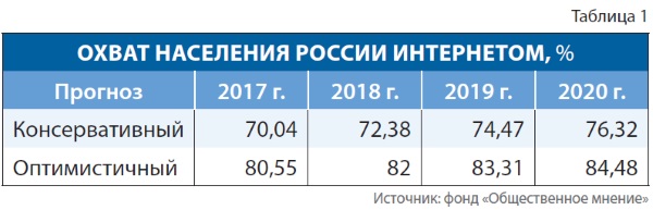 На сегодняшний день аудитория Рунета насчитывает 80,5 млн пользователей (прирост по сравнению с предыдущим годом составил 9,2%). 66,5 млн человек (57%) выходят в Сеть каждый день (+9,3% по сравнению с предыдущим годом). По прогнозу, к 2020 г. три четверти россиян станут пользователями Интернета (табл. 1).