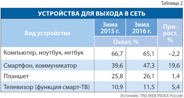 Согласно данным эксперта, 86,2% аудитории в возрасте от 12 до 24 лет активно используют смартфоны, более старшая категория (25–44 года) предпочитает компьютеры и ноутбуки, как и представители возрастной категории 45+. 15% аудитории выходят в Сеть только с мобильных устройств. Число мобильных интернет-пользователей выросло за год на 12,5% (табл. 2).