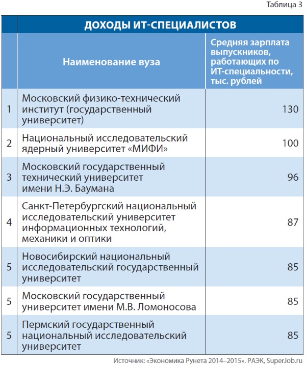 В компаниях и организациях, относящихся к интернет-рынкам, работают около 2 млн человек (включая самозанятое население). Сегодня доля ИТ-специальностей в общем количестве программ подготовки в России составляет 14%. В 951 вузе из 2 607 можно получить специальность, связанную с информационными технологиями. При этом ИТ-университеты равномерно распределены в общем количестве вузов страны, а зарплата их выпускников значительно превышает среднюю по стране (табл. 3).