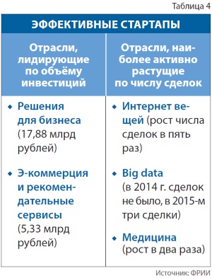 С. Плуготаренко среди прочего отметил, что в 2015 г. инвестиции в ИТ сократились на 43%, а число сделок снизилось на 20%. Наиболее эффективные стартапы представлены в табл. 4.