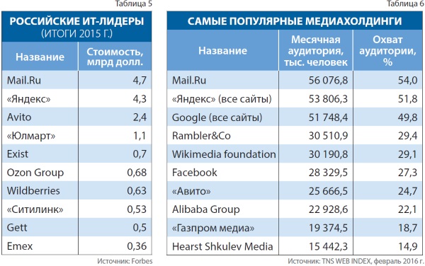По-прежнему Интернет — единственная растущая отрасль экономки в сегменте массовых коммуникаций. По прогнозам аналитиков РАЭК, подготовивших исследование «Экономика Рунета 2015–2016», вклад экономики Рунета в ВВП страны за 2015 год составит 2,3%. При этом самые быстрорастущие рынки — это электронные книги, услуги и онлайн-ритейл. «Мобильная» часть экономики Рунета составляет около 25–30% суммарного объёма рынков.