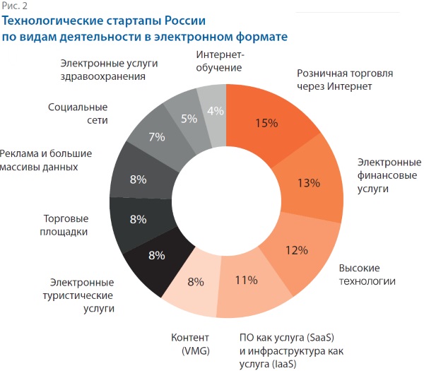 На разных стадиях развития находится около 700 технологических стартапов. В числе лидеров — отрасли электронной торговли (15% стартапов) и финансовых технологий (13%), при этом основными финансовыми услугами являются мобильные платежи и кредитование (рис. 2).