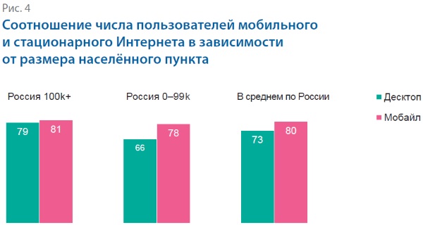 В абсолютных показателях мобильный Интернет более распространён в городах с населением свыше 100 тыс. человек, но в малых городах и селах разрыв между пользователями мобайла и десктопа очевиднее (рис. 4). 76% мобильного трафика идёт через Wi-Fi, эта технология доступна 94% мобильных пользователей.