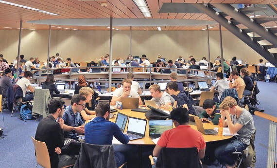 Так, здание библиотеки TU Delft признаётся одним из самых выдающихся в мире. Поражает не только его объём и необычный дизайн: библиотека вырастает из земли, её крыша покрыта травяным газоном, но и огромное количество разнообразных зон для читателей. Здесь есть пространства для групповой и индивидуальной работы, оснащённые компьютерами классы, помещения для рабочих групп. Кстати, во время визита мы не увидели ни одного свободного места из 1,7 тыс. имеющихся! Стеклянные стены позволяют визуально расширить пространство. Свет, падающий из огромного купола, создаёт комфортное освещение практически везде. Фонд открытого доступа размещён вдоль одной из стен, снабжённой системой лестниц и переходов. Любой читатель может прогуляться и оперативно получить нужную книгу.