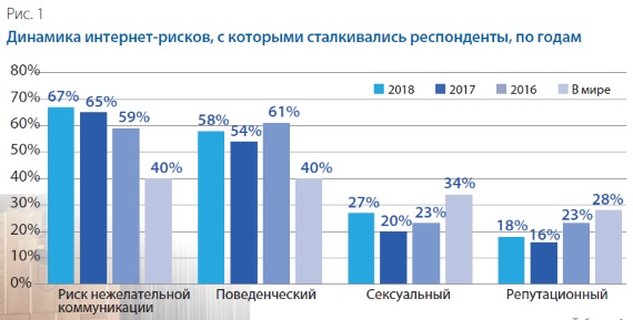 Менеджер по работе с государственными органами Microsoft Эльза ГАНЕЕВА представила результаты исследования индекса цифровой культуры. Как отметила эксперт, Россия по этому критерию заняла 19-е место из 22 проанализированных стран. В 2018 г. рискам в Сети подверглись 74% россиян, и второй год подряд самым распространённым стал риск нежелательной коммуникации, причём показатель этого фактора оказался самым большим (67%) за три года наблюдений (рис. 1).