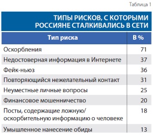 Часто риски проявлялись в форме оскорблений и недостоверной информации в Сети. Так, две трети россиян сталкивались с оскорблениями, практически 40% — с недостоверной информацией и фейкньюз; каждый пятый пострадал от действий финансовых мошенников (табл. 1).