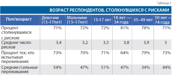 По данным исследования, больше всего интернет-рискам подвергались миллениалы (81%) и представители поколения X (78%) (табл. 2).