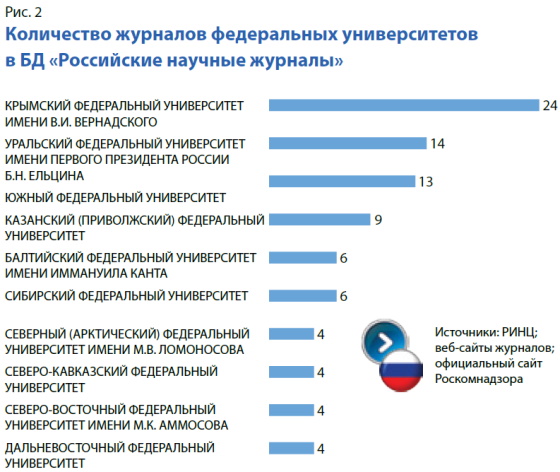 По числу выпускаемых журналов на первом месте оказался Крымский федеральный университет имени В.В. Вернадского. На втором — Уральский федеральный университет, далее Южный и Казанский (Приволжский) федеральные университеты (рис. 2).
