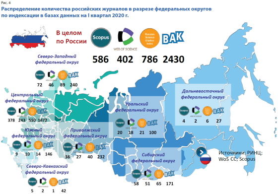 Лидируют Центральный, Северо-Западный и Приволжский ФО. В топ-100 субъектов РФ по числу журналов на первых местах Москва и Санкт-Петербург, Новосибирская и Свердловская области. В топе городов, помимо столиц, Новосибирск, Казань, Екатеринбург, Воронеж, Омск. В рейтинге субъектов РФ по числу журналов, индексируемых в международных базах данных, на третье место поднимается Томская область. В частности, по Scopus на третьем месте Новосибирская область. Система позволяет анализировать журналы по различным научным направлениям. В базу зашиты классификаторы Организации экономического сотрудничества и развития, ВАК и др. На ведущих местах — экономика, клиническая медицина, юриспруденция. При этом можно выделить конкретные журналы, входящие в данные направления.
