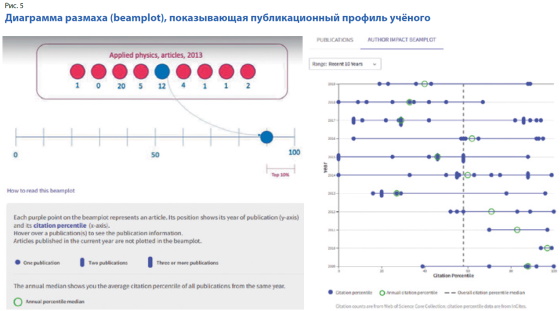 В них публикации распределены по перцентилям цитирования. Чем дальше статья в перцентиле, тем выше её цитируемость. Цифра показывает, как работы данного учёного цитировались по отношению к работам его коллег в той же предметной области. На одном графике можно увидеть всю информацию и по публикациям, и по их цитируемости. Когда работ много, интересно оценить, как цитируется весь массив. При этом можно узнать, что это за работы, где они были опубликованы и где цитировались.