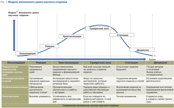 По определению эксперта, жизненный цикл научного издания — это этапы его эволюции: от замысла создания до исчезновения цитирования статей. Модель жизненного цикла представлена на рис. 1.