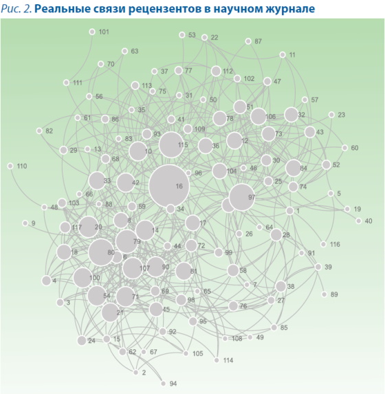 Интересный инструмент — Force-Directed Graph: он позволяет проследить, как выстроены связи между рецензентами в журнале, выяснить, какие тематики наиболее популярны (рис. 2). Скажем, если рецензент А связан с рецензентом В и первый в данный момент занят, можно послать статью его коллеге.