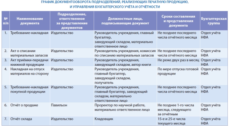 - порядок реализации готовой печатной продукции, в котором определяются объект учёта, подразделения, участвующие в процессе, прописываются функции участников процесса, утверждается график документооборота подразделений, реализующих печатную продукцию, и бухгалтерских служб;