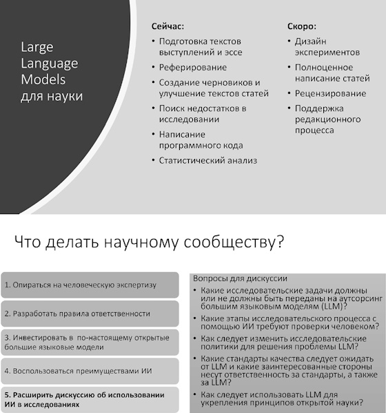 Какие новые возможности эти технологии открывают перед учёными? Они могут быть использованы для реферирования, создания черновиков, написания программного кода, поддержки рецензирования, позволяя экономить время исследователя и способствуя повышению разнообразия научных результатов.