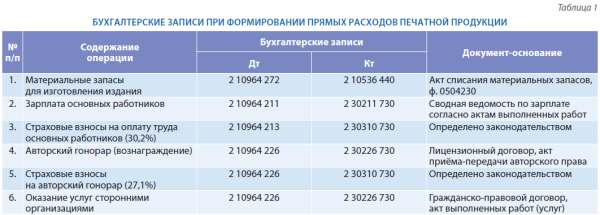 В прямые расходы также включаются авторское вознаграждение, заработная плата работников, непосредственно занятых в подготовке издания, страховые взносы на оплату труда, услуги сторонних организаций, продукция или услуги которых использовались в изготовлении заказа. Для отражения прямых расходов на оплату труда основаниями являются лицензионный договор с автором произведения и акт приёма-передачи рукописи, акты выполненных работ по готовым изданиям (заказам), гражданско-правовые договоры со сторонними организациями и акты выполненных работ (услуг) к этим договорам.