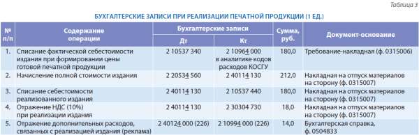 При реализации печатной продукции учитываются все расходы, произведённые в процессе её изготовления. Формирование фактической стоимости печатного издания при его реализации и начисление доходов отражает табл. 3.