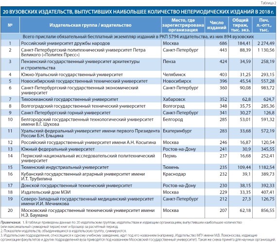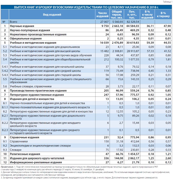 Как показывает анализ табл. 1, совокупный объём издательской деятельности российских вузов — заметная величина. Общее число выпущенных ими в 2018 г. печатных изданий (27 007 единиц) составляет 23% от общего числа изданий в Российской Федерации (116 915 единиц). Не менее впечатляет и то, что из общего числа в 5794 издательства, приславших обязательный экземпляр в РКП, более 15% составляют университетские издательства. Вместе с тем доля вузовских тиражей всего 1,3% от общего (5560,93 тыс. экз. из 432 336,14 тыс.). Издательская деятельность по-прежнему является важнейшей составляющей частью высшей школы: из 1171 вуза 894 (76%) участвуют в системе обязательного экземпляра. При этом достаточное разнообразие ассортимента и малые тиражи свидетельствуют о том, что вузовские издательства активно используют технологии «цифры», печати по требованию и пользуются услугами внешних полиграфических предприятий.