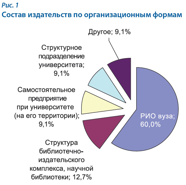 В исследовании, проведённом методом электронного анкетирования, приняли участие 109 руководителей структур, которые мы будем обобщённо называть университетскими издательствами. Их состав по организационным формам иллюстрирует рис. 1. Как показывает анализ, большинство респондентов (60,0%) представляют редакционно-издательские отделы (РИО) вузов или другие подразделения университета. 12,7% указали, что издательство входит в структуру библиотечно-издательского комплекса или научной библиотеки. 9,1% опрошенных указали, что издательство является самостоятельным предприятием. Столько же респондентов назвали другие формы, в частности некоммерческую организацию, а в Новосибирском институте органической химии (НИОХ) имени Н.Н. Ворожцова СО РАН подчеркнули: «Научный институт самостоятельно издаёт сборники конференций в электронном виде, участвует в составе организаций — учредителей одного из журналов издательства СО РАН и использует аутсорсинг — прибегает к услугам сторонних издательств».