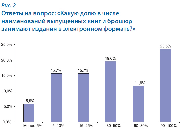 На вопрос: «Какую долю в числе наименований выпущенных книг и брошюр занимают издания в электронном формате?» — 7,8% респондентов ответили, что такие издания не выходят. Ответы тех, кто выпускает цифровой формат, представлены данными рис. 2. Из анализа следует, что респондентов, у которых доля электронных изданий свыше 60%, более трети: 35,3%. Такой же процент составляют те, у кого доля «цифры» от 15 до 50%. В Камчатском ИРО, в частности, отметили, что с 2023 г. перешли на электронные издания, а печатается только журнал «Камчатский педагогический вестник», зарегистрированный как СМИ. В ФГБОУ ВО «КГТА имени В.А. Дегтярёва» подчеркнули, что выпускают электронную версию каждого печатного издания.