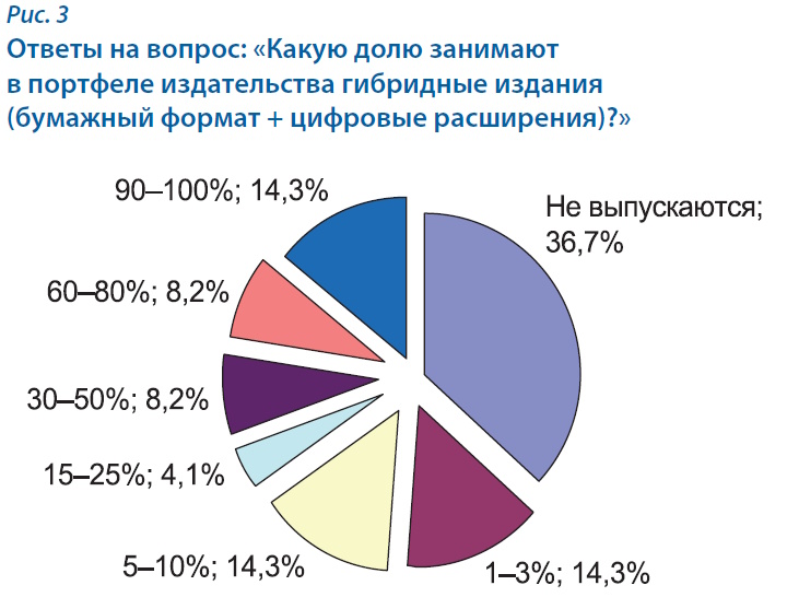 Подтверждает этот вывод и анализ ответов респондентов на вопрос: «Какую долю занимают в портфеле издательства гибридные издания (бумажный формат + цифровые расширения)?» (рис 3). В частности, 36,7% опрошенных сообщили, что такие издания не выпускаются.