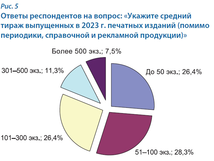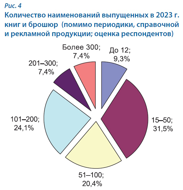 Ответы респондентов на вопрос о том, какое количество книг и брошюр (помимо периодики, справочной и рекламной продукции) было выпущено ими в 2023 г., иллюстрирует рис. 4. Анализ показывает, что более половины опрошенных сообщили, что издали от 15 до 100 наименований. Больше 200 названий выпустили, по их собственной оценке, около 15% респондентов.