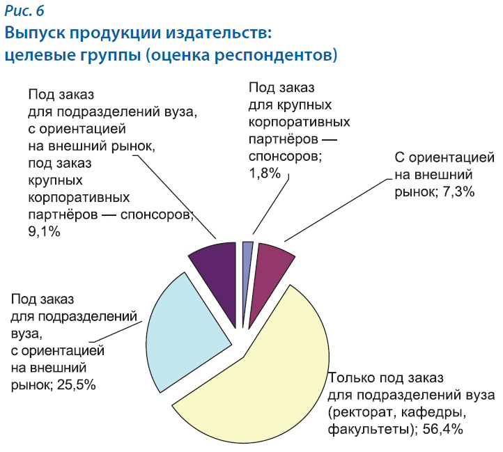 По оценке респондентов, 56,4% из них работают исключительно под заказ подразделений вуза. 7,3% выпускают продукцию, ориентируясь на внешний рынок, 1,8% — для корпоративных партнёров — спонсоров. Остальные (34,5%) сочетают различные целевые группы потребителей (рис. 6).