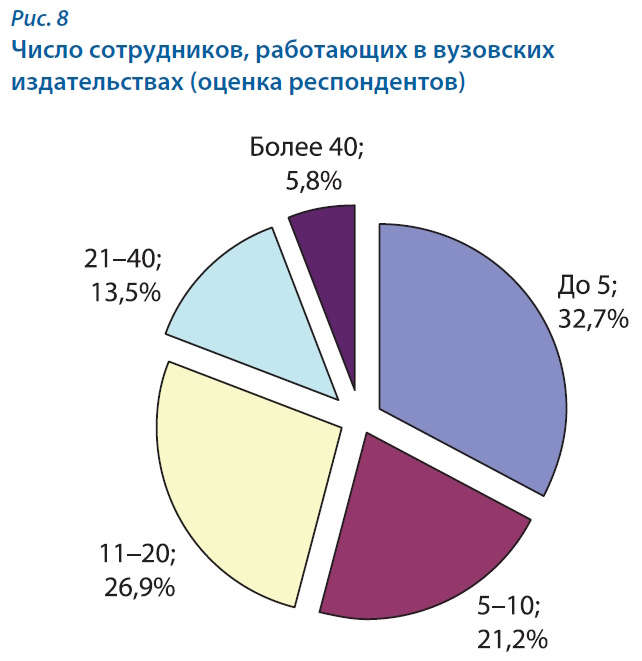 Оценки респондентов относительно количества сотрудников в издательствах иллюстрирует рис. 8. Как показывает анализ, почти 54% опрошенных сообщили, что это число не превышает 10 работников. Крупных издательств, в которых работает более 40 человек, всего 5,8%.