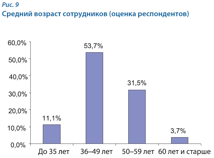 Что касается среднего возраста сотрудников, то, по оценке 53,7% опрошенных, он составляет от 36 до 49 лет. Ещё 31,5% респондентов сообщили, что средний возраст их работников — 50–59 лет. Таким образом, по оценке издателей, более трети работающих в вузовском книгоиздании — люди предпенсионного и пенсионного возраста (рис. 9).