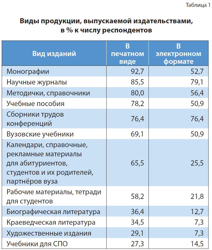 Виды продукции, выпускаемой респондентами, представлены данными табл. 1. Из анализа следует, что подавляющее большинство издателей выпускает в печатном виде монографии, научные журналы, методички и справочники, учебные пособия, сборники трудов конференций. При этом вузовские учебники, хотя и занимают почти 70% в ответах респондентов, находятся лишь на шестом месте в рейтинге видов продукции. Интересно, что сборники трудов конференций одинаково популярны и в печатном формате, и в электронном.
