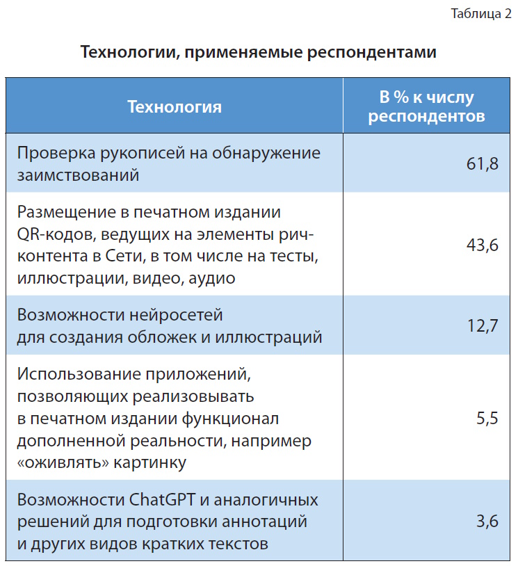 Что касается других технологий, применяемых издательствами, то их распространение характеризуют данные табл. 2. Как показывает анализ, большинство (61,8%) проверяют рукописи на предмет имеющихся заимствований. 43,6% ответили, что размещают в печатных изданиях QR-коды, ведущие на элементы рич-контента в Сети, в том числе на тесты, иллюстрации, видео и аудио. Однако если вновь обратиться к рис. 3, то, вероятнее всего, эти элементы — не ресурсы собственной генерации, а имеющийся в Интернете сторонний контент.